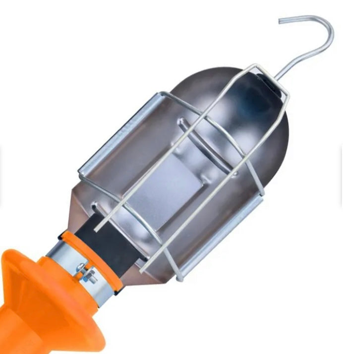 Práctica lámpara de trabajo Halux. ¡Con su cable de 5 metros, llegarás a cualquier rincón con comodidad! Su diseño naranja y cobre le da un toque moderno y resistente, ideal para cualquier tipo de trabajo. Su tamaño compacto de 38 cm de largo y 13 cm de alto la hace fácil de guardar.
